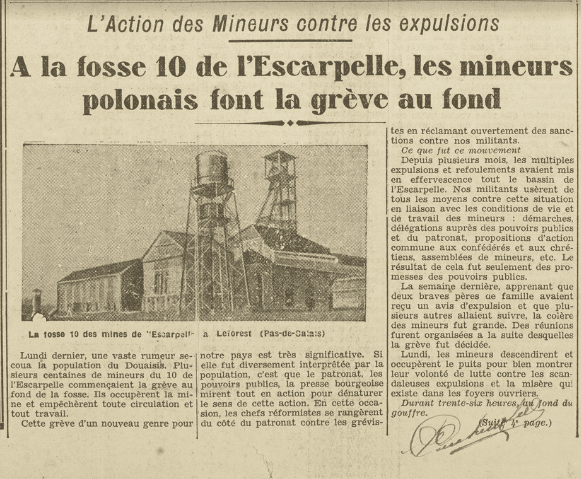 Une grève importante éclate à Leforest le 26 mai 1934 où 200 mineurs polonais s’enferment dans les lavabos-douches de la fosse 10 pour protester contre l’arsenal répressif (amendes, brimades, licenciements) déployé par la Compagnie des mines de l’Escarpelle contre les travailleurs étrangers. Pour toute réponse, le gouvernement signe onze décrets d’expulsion visant les meneurs le 21 juillet 1934.