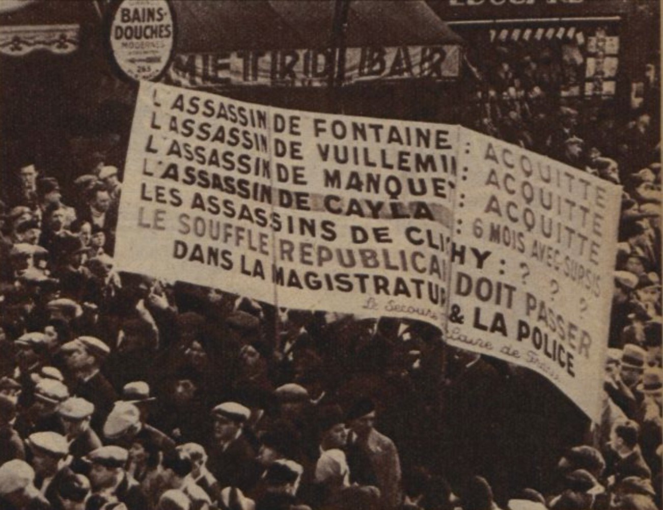 La contre-manifestation de Clichy vire malheureusement au drame. À la suite de coups de feu dont l’origine est encore aujourd’hui incertaine, la foule des manifestants prend à partie les forces de l’ordre chargées de protéger la réunion du PSF, qui ouvrent le feu sur les contre-manifestants.