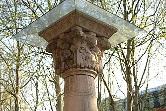 Les quatre bas-reliefs du chapiteau représentent la maternité, l’amour, la consolation et la mort. L’infirmière et institutrice Louise Michel apparaît embrassant le géographe Élisée Reclus sur la face de la consolation et le révolutionnaire Auguste Blanqui sur la face de la mort.