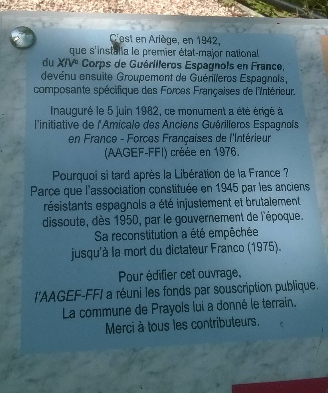 Ben non non... Il faut tomber sur le minuscule et charmant village de Prayols, à 6 km au sud de Foix, sur la D8A pour trouver le Monument national des guérilleros espagnols. Le monument a été inauguré par Mitterrand et Gonzáles en 1982.