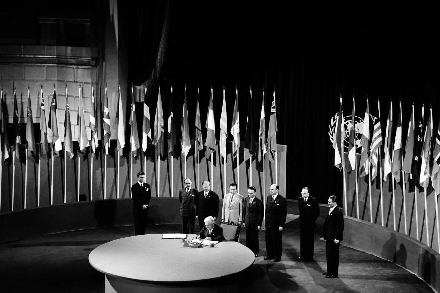 Quand les délégués de 50 pays se réunissent à San Francisco au printemps 1945, l’ombre des dizaines de millions de morts de la Seconde Guerre mondiale plane sur les débats, le conflit perdure en Asie-Pacifique. Il s’agit de ne pas répéter les erreurs de l’entre-deux-guerres, l’échec de la Société des Nations (SDN). La Charte adoptée le 26 juin fonde l’ONU sur des principes clairs : souveraineté des États, règlement pacifique des différends, développement économique et social, respect des droits fondamentaux.