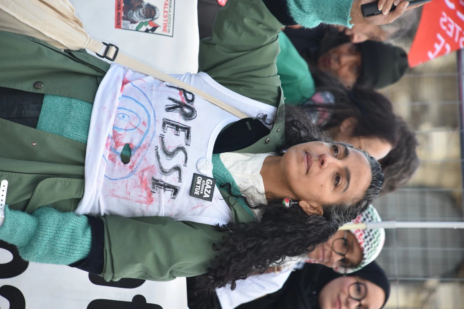 Les blouses blanches, pour les professions de la santé, ont été mises à l’honneur. Les intervenants ont souligné que les hôpitaux palestiniens pris pour cible par l’armée israélienne font partie de la résistance contre les frappes et la volonté d’anéantir la bande de Gaza. Une autre profession a été mise en exergue : celle des journalistes. Les journalistes occidentaux ne peuvent entrer à Gaza (il leur faut trois autorisations : celles d’Israël et de l’Égypte, refusées systématiquement, et celle des associations humanitaires pour les encadrer sur le plan sécuritaire). Cette dernière est toujours acceptée, mais elle ne suffit pas.